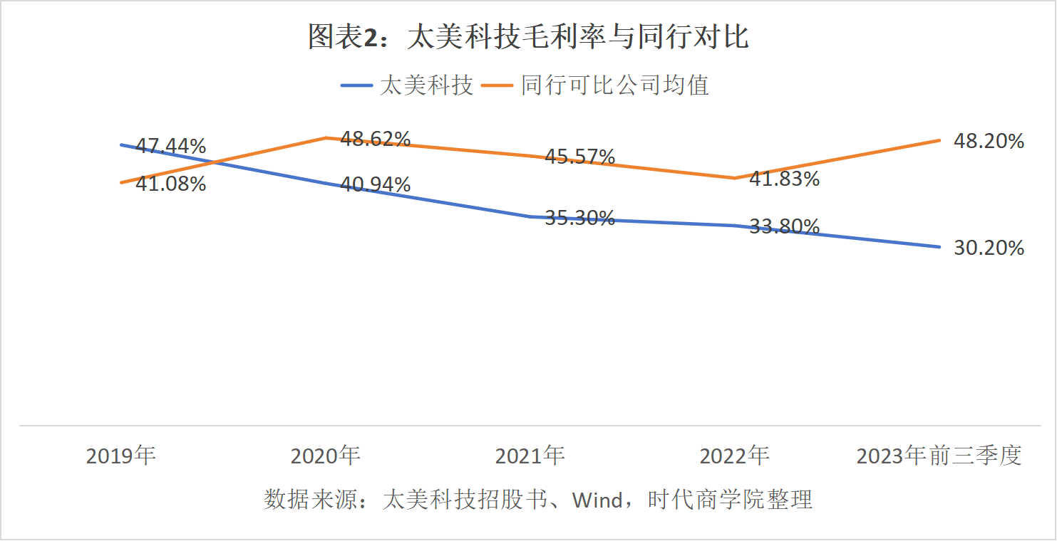 招股书显示,2019—2023年前三季度,太美科技的营收分别为1.87亿元、3.03亿元、4.66亿元、5.50亿元和4.11亿元,同期毛利率分别为47.44%、40.94%、35.3%、33.8%及30.2%。